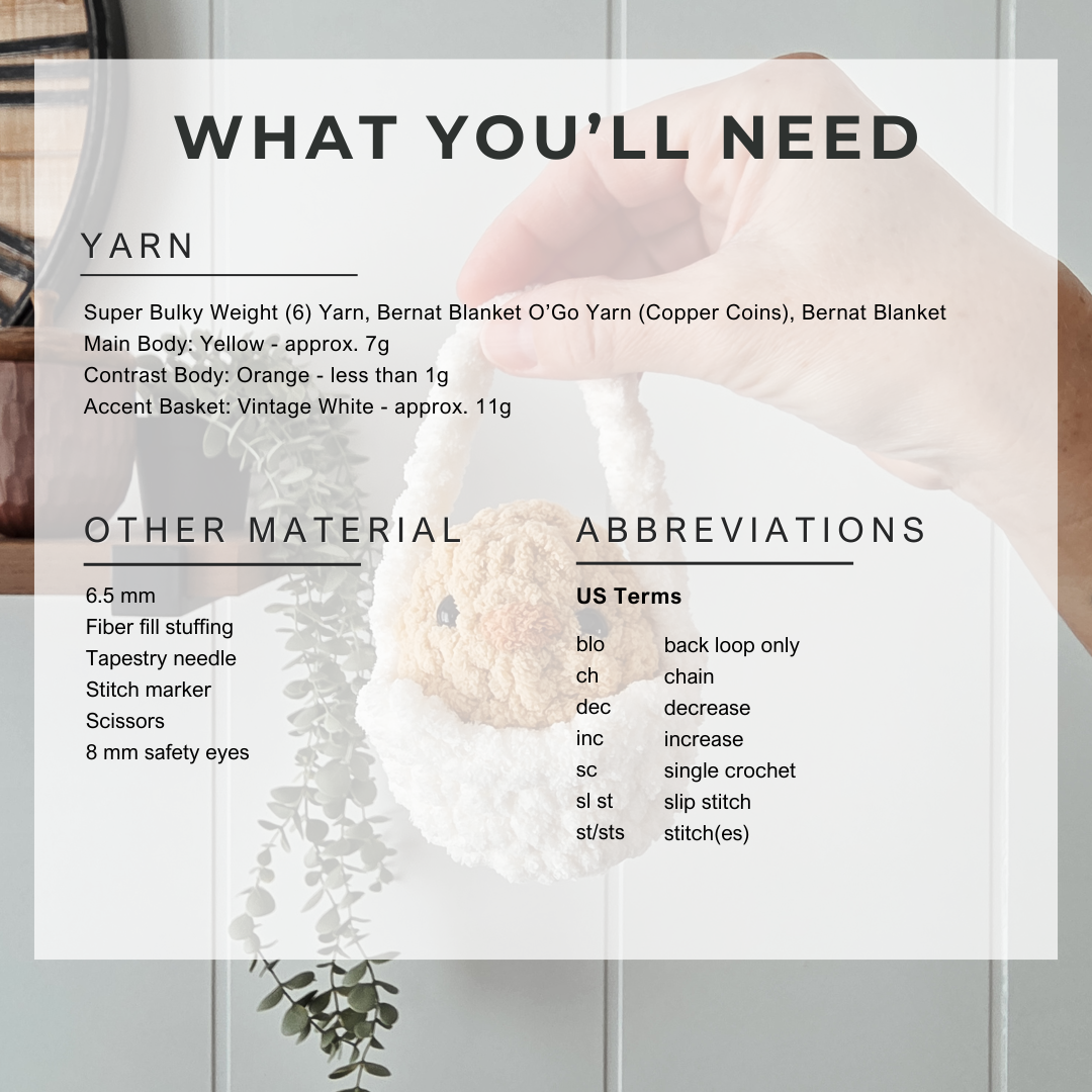 • Super bulky weight yarn (6) for the chick and basket
