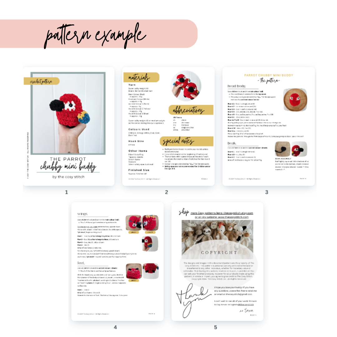 -- Included in the instant download is pattern instructions (written in ENGLISH, US terminology) on how to make your own Parrot Chubby MINI Buddy.