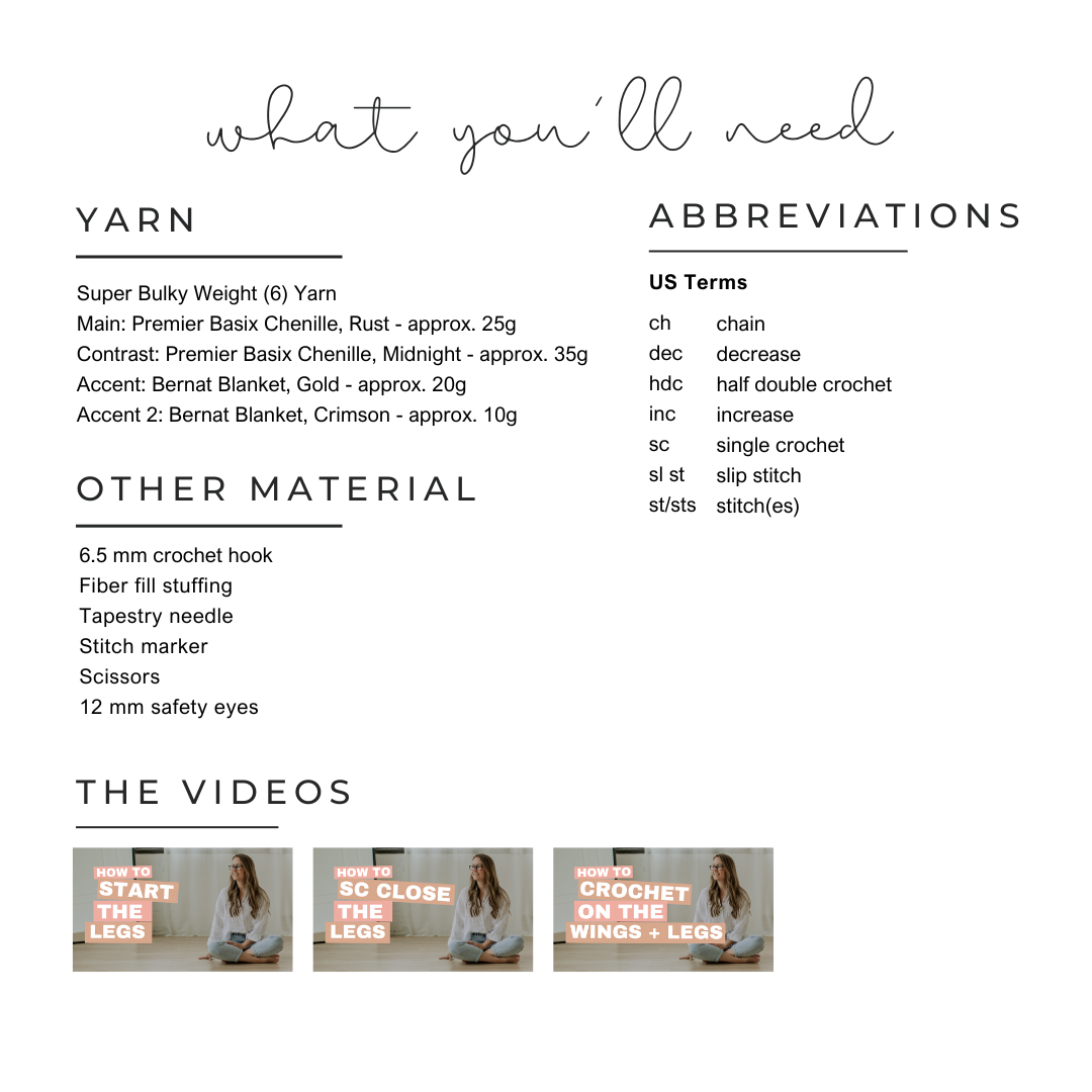 -- The pieces to sew include the beak and an option to sew the wings + legs (as well as, a low-sew option to crochet on the wings + legs). Worked using surface stitches is the wattle, the comb, and the tail.
