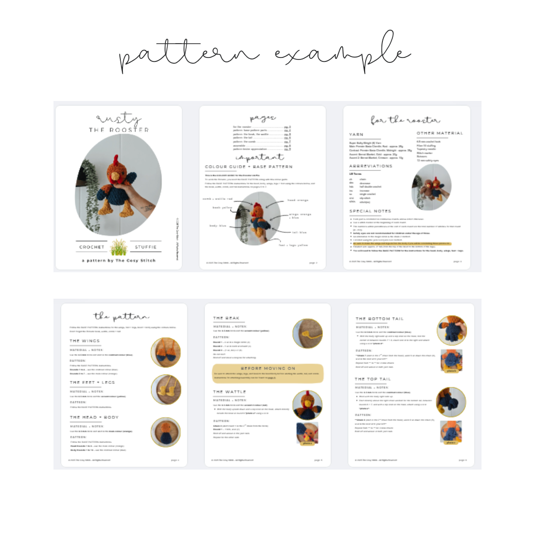 -- Included in the instant download is pattern instructions for the Rooster's beak, wattle, comb, and tail + a COLOUR GUIDE for the Rooster stuffie.