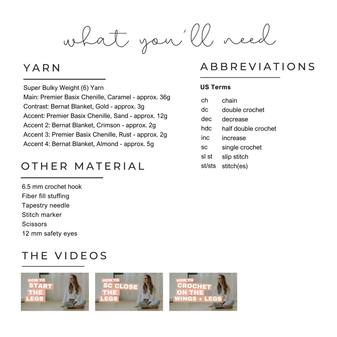 -- The pieces to sew include the beak and an option to sew the wings + legs (as well as, a low-sew option to crochet on the wings + legs). Worked using surface stitches is the snood and the tail.
